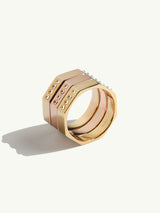 The Octavian Triptych Tower Ring by jewelry designer Angie Marei features an architectural and geometric design handcrafted in a luxurious 18-karat yellow and rose gold precious metal, accented with burnish-set brilliant white diamonds adding fire and brilliance to this bold and unique piece.