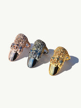 The Calavera Rosa Nail Rings by Angie Marei feature intricate hand-carved skulls and roses. Skulls have been worn throughout history as symbols of mortality, balance, duality, unification, and enlightenment. These rings serve as a reminder of life’s transience and the importance of our time on Earth.