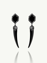 The Alexandria Horn Talisman Drop Earrings by New York jewelry designer Angie Marei feature a striking sensual design inspired by the art deco period and talismans worn by ancient Egyptian royalty. The sleek black Onyx Agate stones are beautifully carved and honed by the hands of skilled artisans. Exquisitely handcrafted in blackened 18-karat white gold. Horn-shaped talismans, also known as the cornicello, Italian for the Devil's Horn, have been worn to protect against the evil eye since ancient history. It is believed that no danger could ever touch the wearer if it were worn as an amulet.