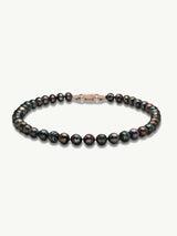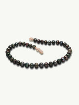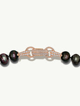 The Nyx Tahitian Black Pearl Necklace by designer Angie Marei is a daring new take on the classic pearl necklace. This unisex piece features multi-colored Tahitian Black Circle Pearls and a custom-designed hardware-inspired clasp crafted from luxurious 18k rose gold with pavé set brilliant cut white diamonds, designed to be worn front or back, depending upon your preference.