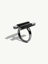 The Invidia Black Onyx Column Ring is a bold yet elegant statement piece, meticulously handcrafted in luminous blackened 18-karat gold. At its center, a sleek column of polished black onyx is framed by perfectly aligned straight baguette-cut white diamonds, creating a striking architectural silhouette. The linear precision of the diamonds evokes the geometric sophistication of the Art Deco era, while the opulent gold and onyx combination channels the divine grandeur of Ancient Egyptian royalty.