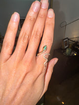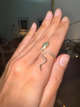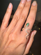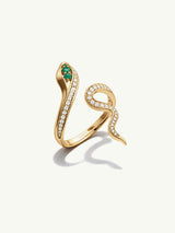 The Uraeus Diamond Serpent Ring is a striking symbol of power, protection, and eternal allure. Handcrafted in luminous gold, this sculptural serpent coils gracefully around the finger, adorned with brilliant white diamonds and vivid emeralds set into the serpent’s regal head.