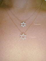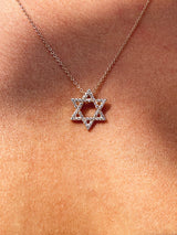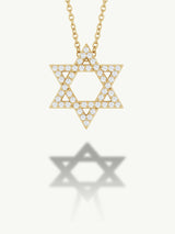 A timeless emblem of faith, identity, and divine protection, the elegant Star of David pendant necklace—crafted in lustrous 14-karat gold and adorned with brilliant pavé-set white diamonds. Each facet of the six-pointed star catches the light, symbolizing harmony between the spiritual and physical realms. Suspended from a delicate chain, this radiant piece is both a sacred talisman and a refined expression of personal style.