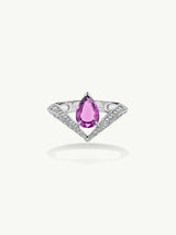 The Dorian Teardrop-Shaped Floating Diamond Engagement Ring by Angie Marei features a brilliant-cut pear-shaped vivid pink sapphire designed to mirror a water droplet delicately held in suspension. This stunning piece is skillfully handcrafted of Platinum and encrusted with rows of brilliant-cut pavé white diamonds. Visualize the soft waves of the ocean as they bind together with the strength of the human spirit.