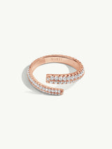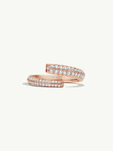 The Pythia Serpentine Coil Ring by Angie Marei features beautiful sparkling brilliant-cut round white diamonds French-pavé set on an 18-karat rose gold knife-edged ring. Inspired by Ancient Egyptian serpent jewelry, this contemporary design resembles a coiled serpent – the ancient symbol of royalty, divine authority, rebirth, immortality, and transformation – that seductively wraps around the finger. A fusion of sculpture and jewelry that delicately captures the essence of femininity and whispers erotic.