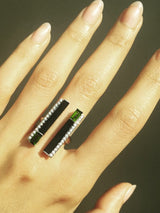 The Invidia Black Onyx Column Diamond Ring by Angie Marei is masterfully handcrafted in opulent 18-karat rose gold. This sculptural piece features striking columns of hand-carved and polished black onyx, flanked by step-cut baguette white diamonds and pavé-set brilliant-cut round white diamonds. Sleek, structured, and architecturally bold, this design draws inspiration from the refined elegance of the Art Deco era and the rich visual language of Ancient Egyptian art.