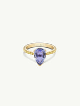 The deco-inspired Phebe Ring by New York jewelry designer Angie Marei combines luxury and elegance into one stunning piece of jewelry. A purple sapphire center stone is cut in a timeless, brilliant pear shape surrounded by a halo of scintillating, radiant, brilliant yellow diamonds. Exquisitely handcrafted in 18-karat yellow gold, this piece is sure to impress.
